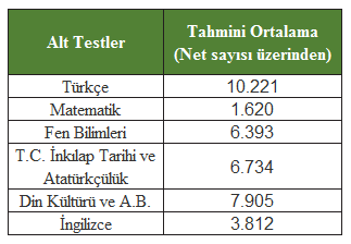 Bu tabloya bakıldığında sadece doğru üzerinden ortalama paylaşıldığı görülüyor. TEOG öncesi yıllarda ders bazında net ortalamalar yani yanlışların 3te1’inin doğrulardan çıkarılmış halinin ortalaması ile her derse ait standart sapmalar da paylaşılıyordu. Sizler için derslerin net üzerinden tahmini ortalamalarını gösteren bir tablo hazırladık.